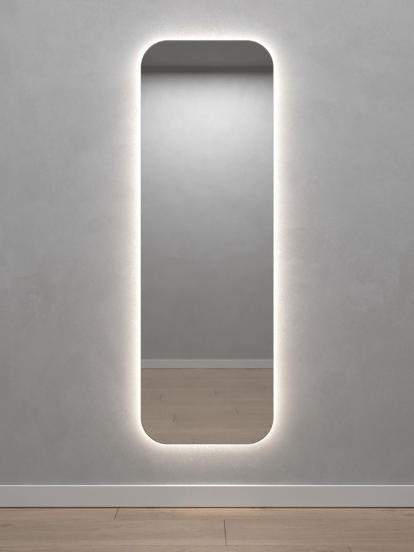 Безрамное зеркало прямоугольной формы с контурной (тыльной) тёплой подсветкой, свет 3000К. Подложка из высококачественного МДФ, светодиодная лента защищена матовым свето-рассеивателем от попадания пыли и влаги. Есть вывод 220W для подключения к сети, включение подсветки от сенсорной кнопки на зеркале, её расположение на зеркале можно выбрать на заказ.